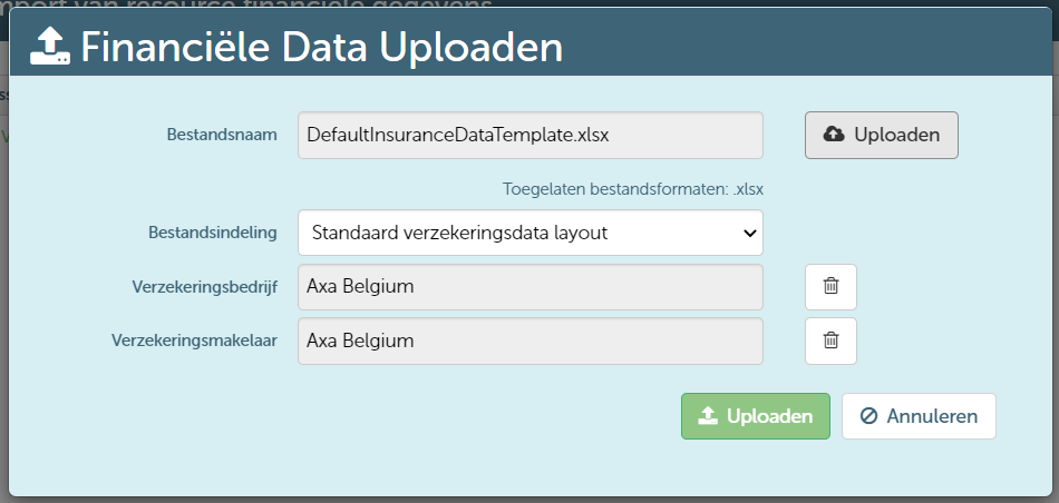 If the file contains the necessary information, you can upload it using the "Upload" button next to the button where you could download the template. Depending on the type of file you can search for an insurer/broker or financier. This search list only includes customers with the checkbox "Is supplier" checked.
