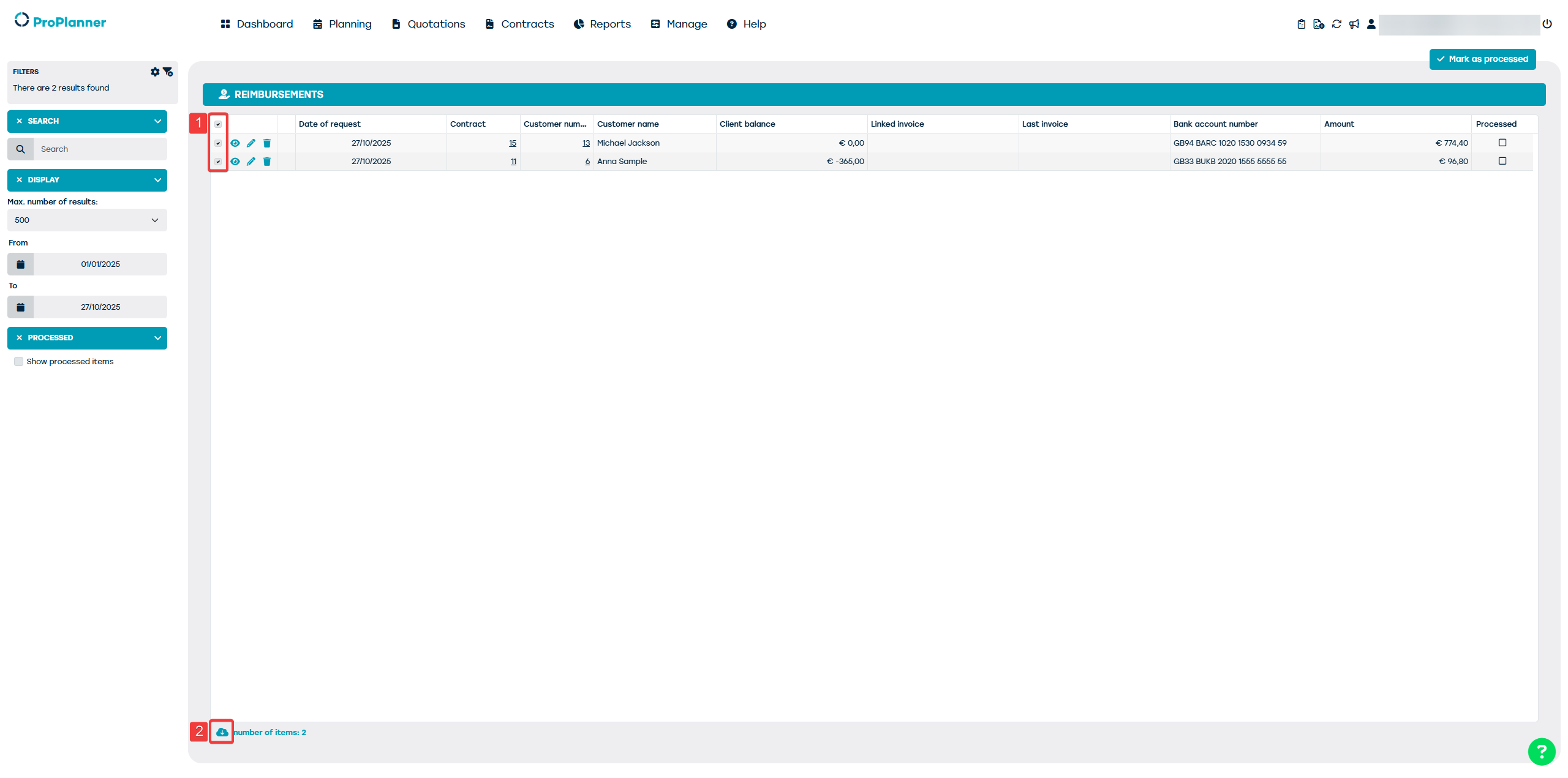 - Within the overview of the repayments, you can manually select a number of repayments to be performed (1) and then click on the export icon (2):