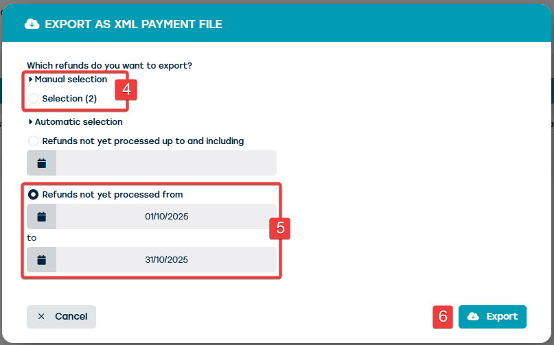 - However, you can also choose to click on the export icon immediately without making a selection first. Then click on the option "Export as XML payment file" (3) and indicate which reimbursements you want to export. Here you can export your own made selection (4), or choose automatic selection of not yet processed reimbursements within a certain period (5).