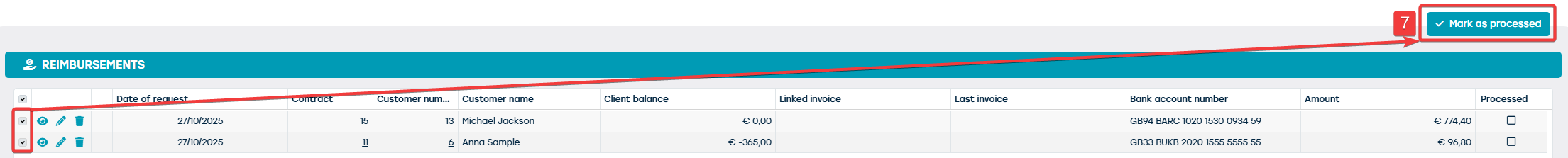 If you have manually performed a refund, you can also manually mark it as "Processed" using the "Mark as processed" button at the top of the screen (7). This button will only be active if refunds have been selected in the list.