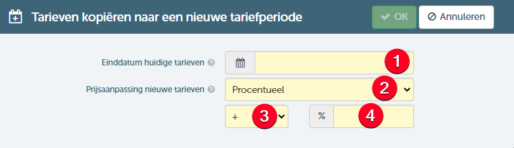 In the overview of the rates (Management > Prices >Rates), you will find a button labeled "Actions" at the top. Clicking on this will show you, among other options, the option to "Copy rates to a new rate period". This option will only be active if at least 1 rate has been selected.