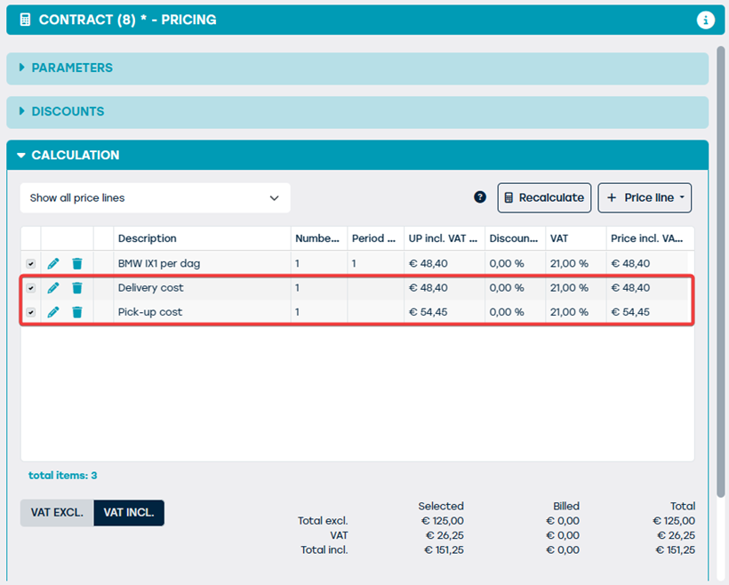 After recalculation in the Pricing tile, one or two price lines will automatically appear, depending on the options selected. The amounts correspond to the settings in the general management or the customer-specific settings (see “Customer-specific settings”).