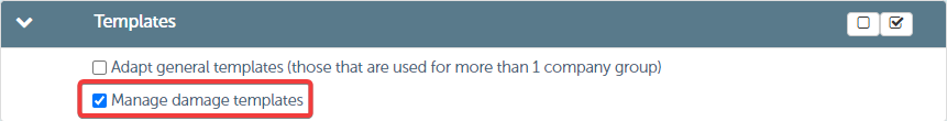 - To create and/or modify damage templates, the user must have an additional right, which can be set up via managa (users and rights) - roles general– templates – Manage damage templates