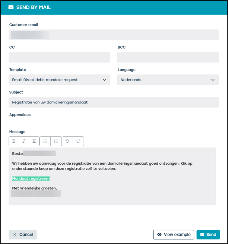 If you choose the ‘SMS’ option, the customer will receive an SMS with further instructions. You can determine the content of this SMS yourself from your Twikey account. When you choose the ‘email’ option, a pop-up screen will open where you can edit the email message if desired.