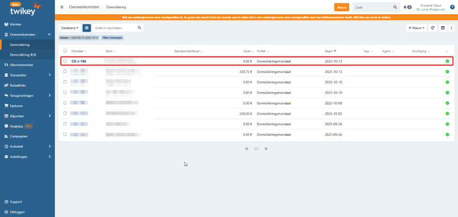Via the customer file in ProPlanner, you can now retrieve the details using the mandate number in Twikey.