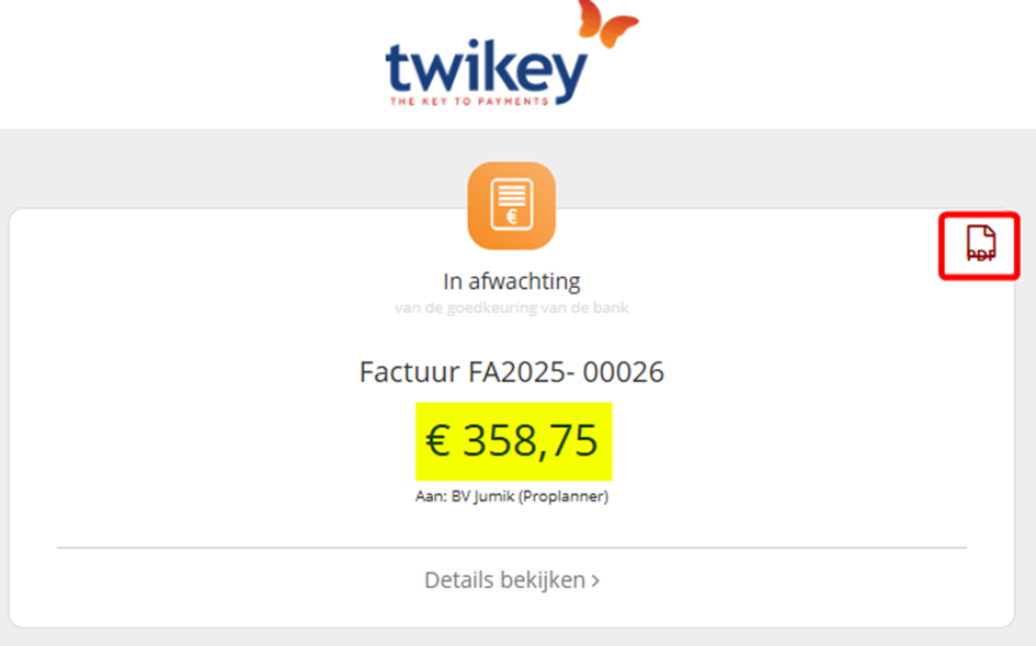 Twikey then submits the payment order for €358.75 to the bank. Once the invoice has been paid, the payment status is updated to ‘fully paid’ in ProPlanner.