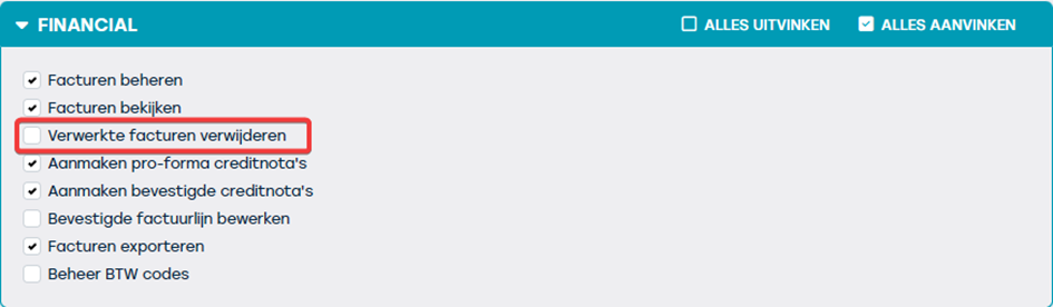 It is also possible (provided you have the necessary rights) to delete invoices that Twikey has already submitted to the bank in ProPlanner. These rights can be assigned to certain roles via Management > Rights > Delete processed invoices.