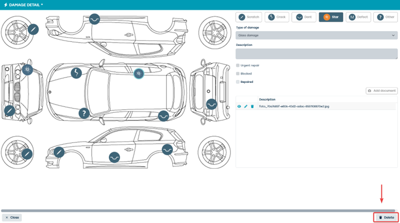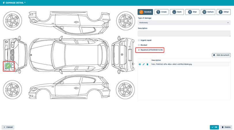 You can also mark a damage as repaired when you open the damage via the pencil icon. It is then marked in green and stored in the database.