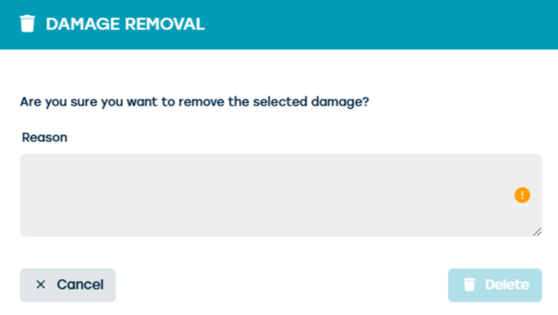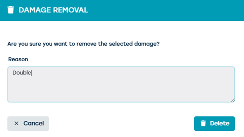 When you open a contract at check-in/check-out and click on an existing damage, the delete button becomes visible. If the permissions with and without reason to delete contract related damages are active, you will be prompted by default to enter a reason.