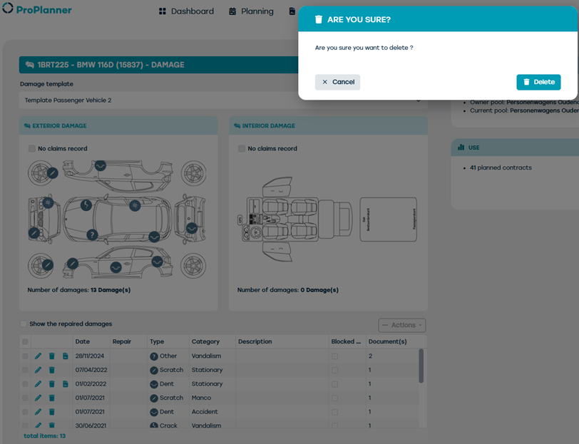 ProPlanner offers extensive capabilities for managing damages, with specific permissions that determine who can perform which actions. Depending on your permissions, you can delete damages with or without reason, at the individual level and/or in bulk. Permissions allow you to efficiently manage damages on a contract or resource sheet. General permissions on resource - detail screen level are the following: