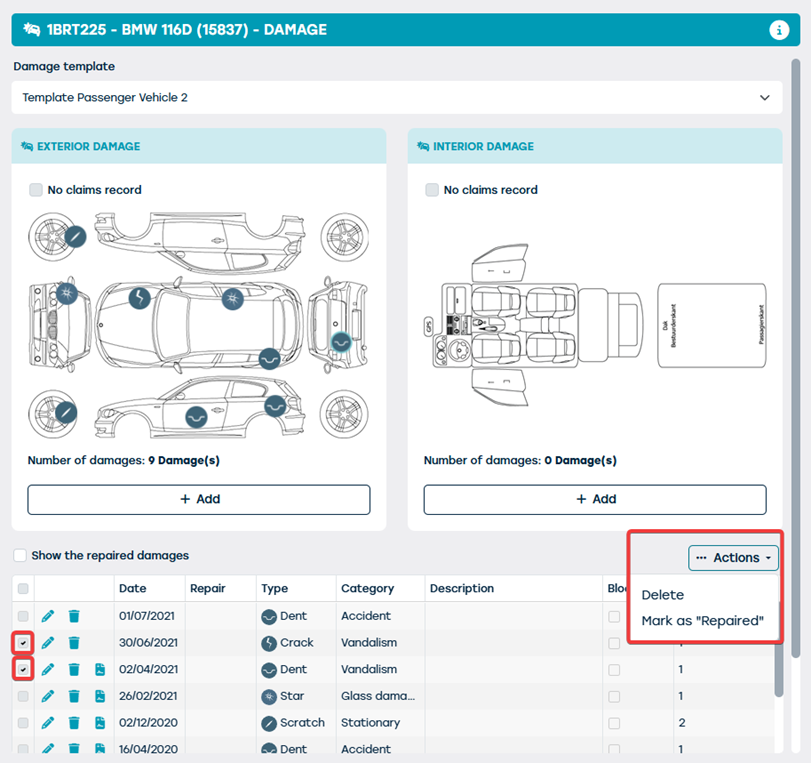 Bulk damage removal can only be done on the resource sheet on the web (not on the tablet). Only the permissions without reason are valid for bulk deletion (if you have the permissions with reason active, you cannot delete in bulk and will have to do it one by one). If you select multiple damages, then depending on your permissions you can select the options 'delete' and 'mark as repaired' via the 'actions' button.
