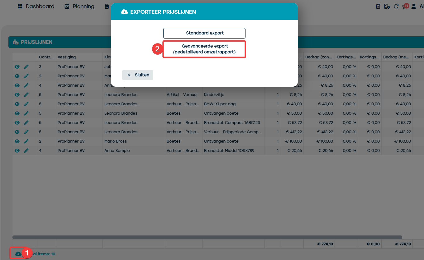 Once everything is displayed, you can export using the cloud icon at the bottom (1). In the pop-up, you will have the choice between a standard export and an advanced export (detailed revenue report) (2).