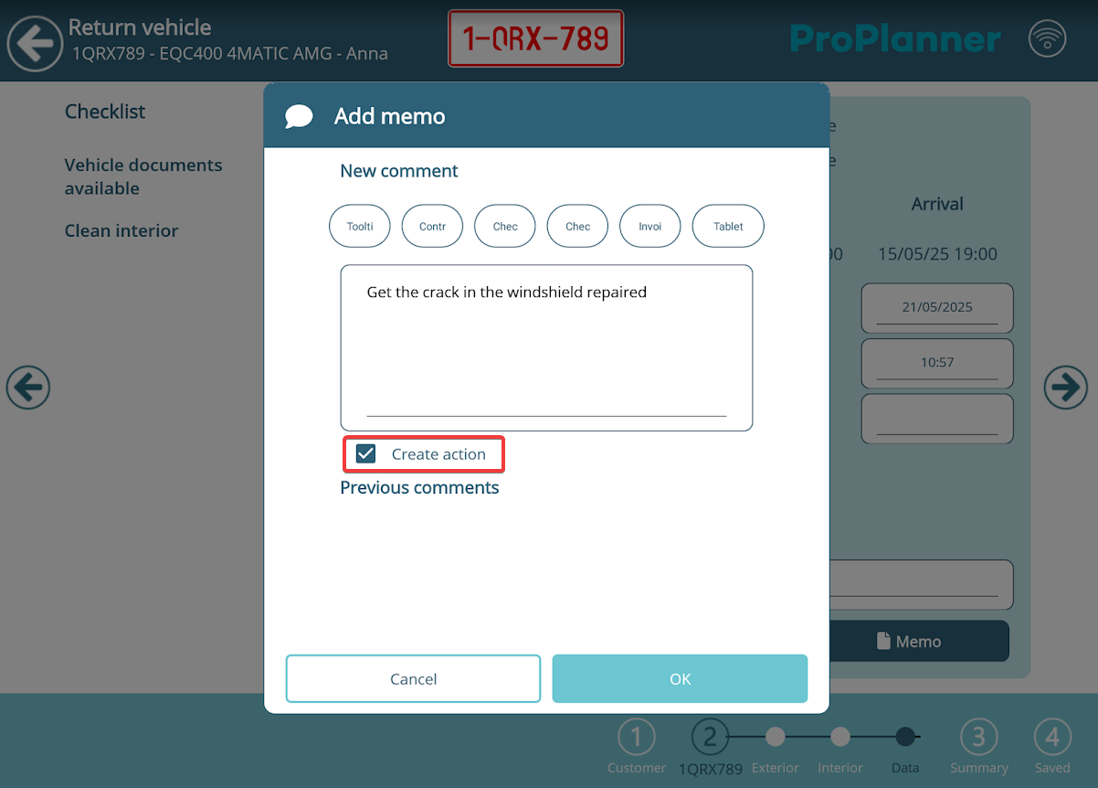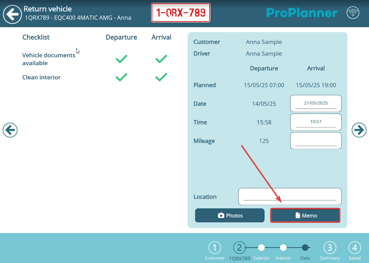 During the usual check-in or check-out flow, you’ll reach a screen where you tick off checklist items, adjust the mileage and fuel level, and optionally add a memo.