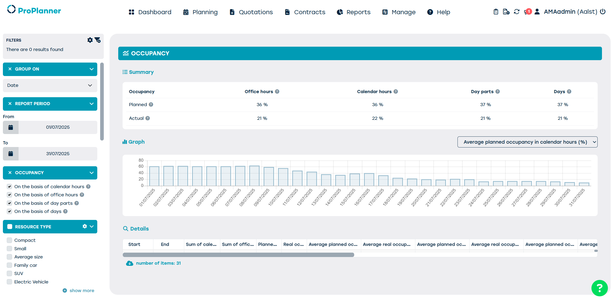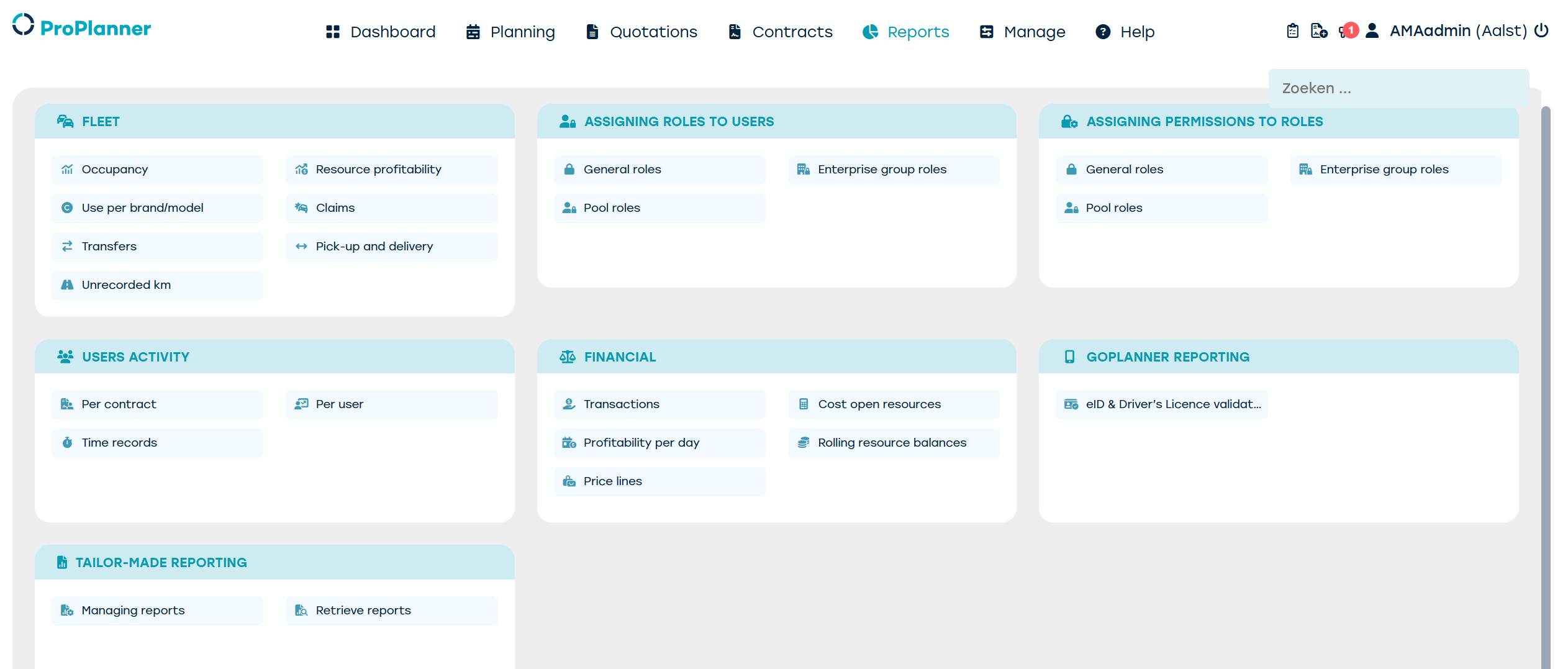 Here you select which reports you'd like to consult, like fleet occupancy, claims, resource profitability, etc.