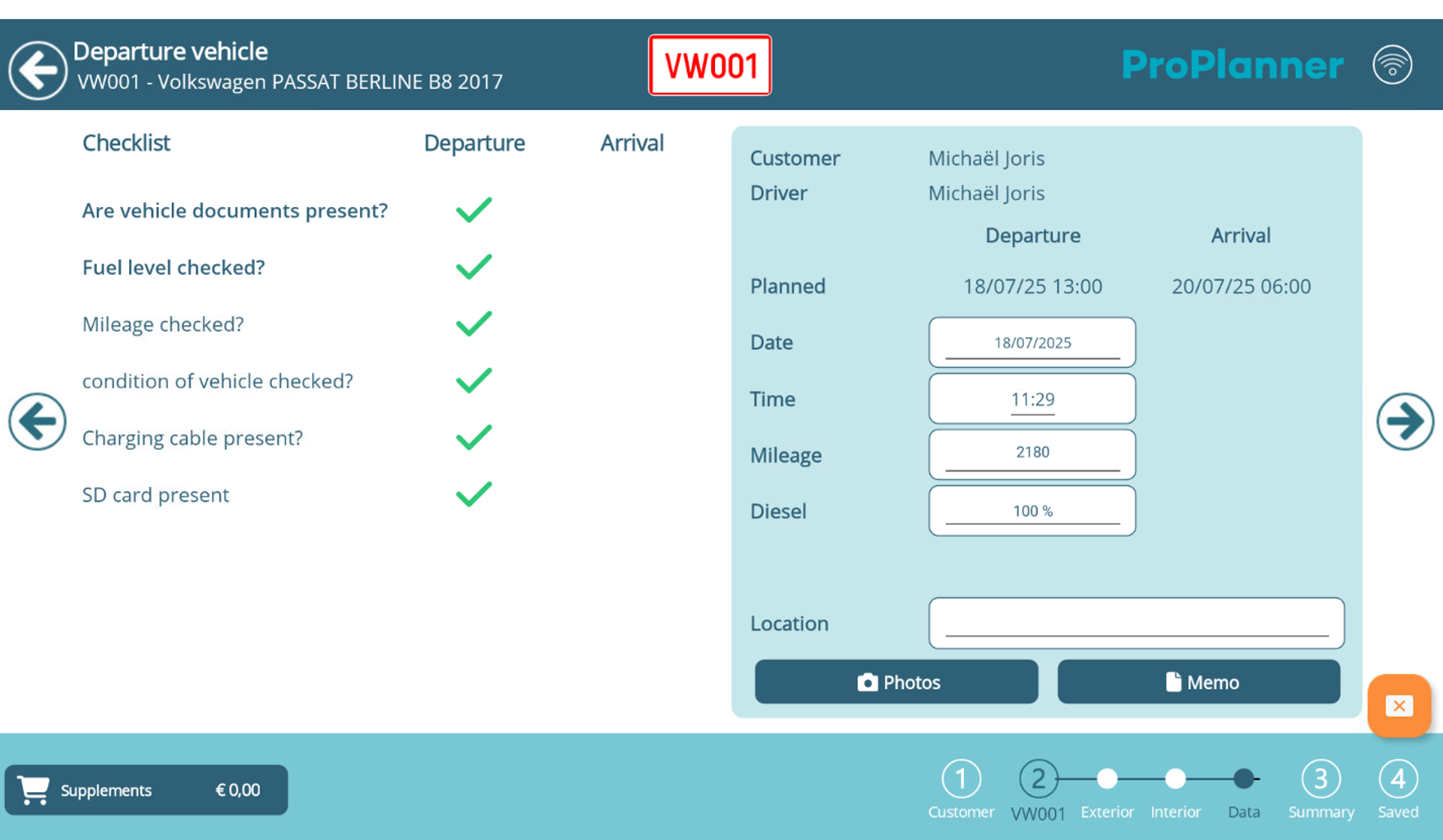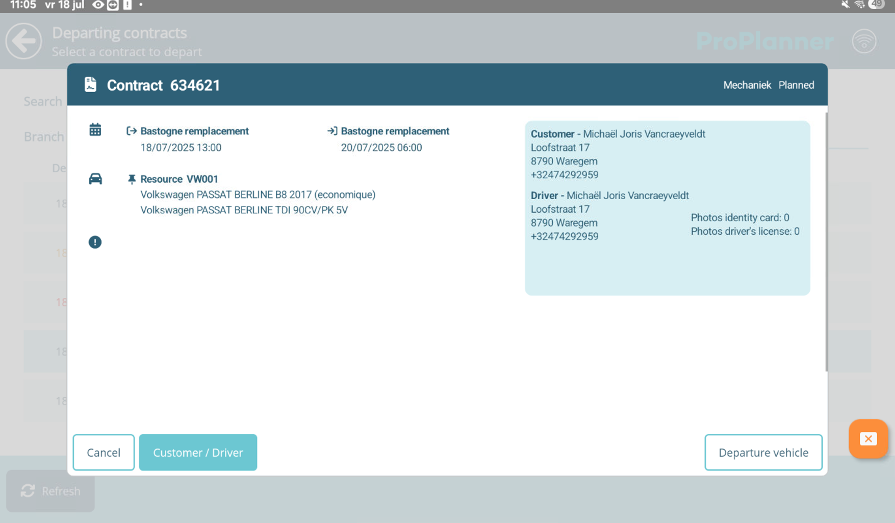 In the next screen we see the contract details. We move on by clicking departure vehicle.