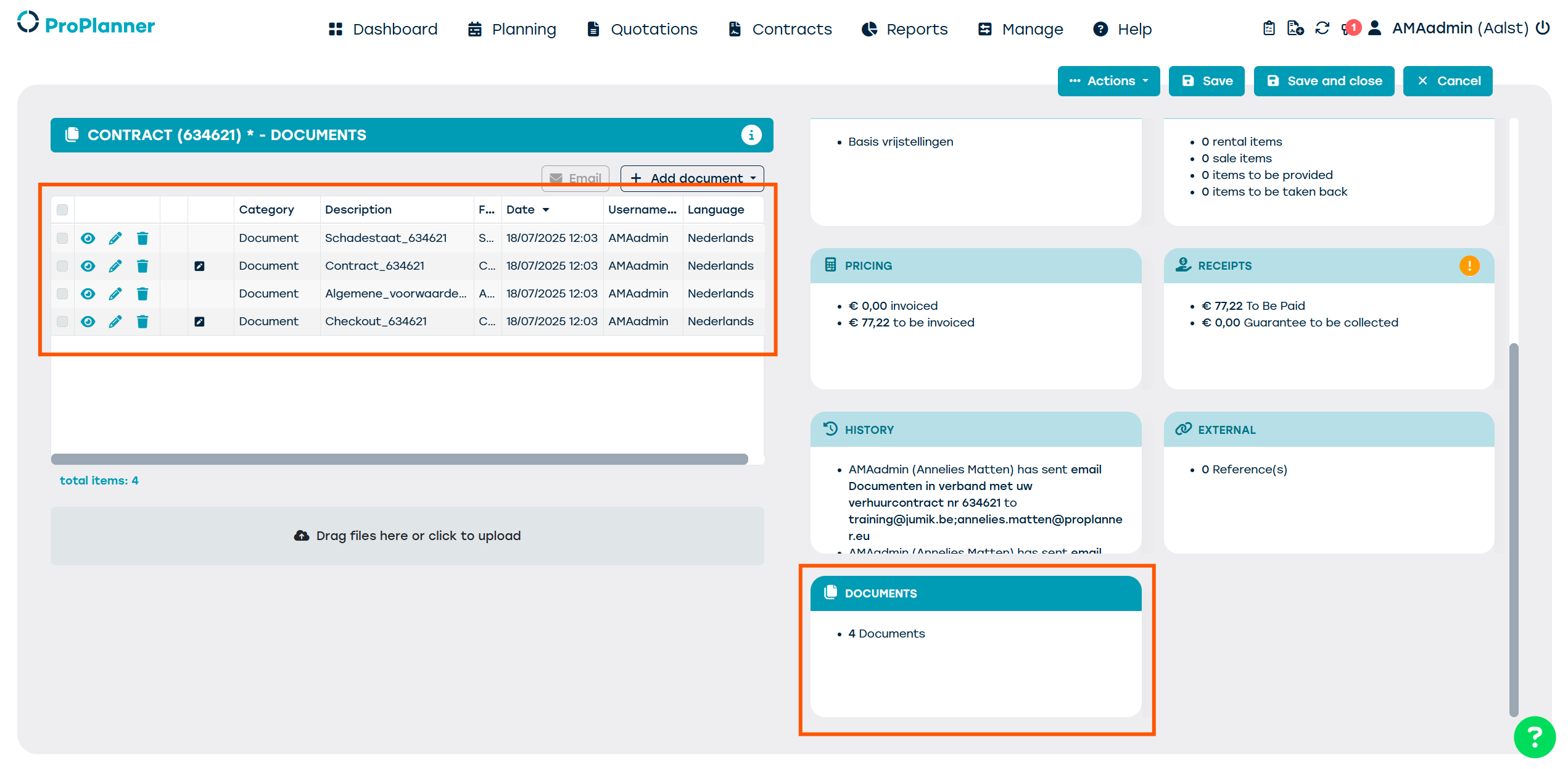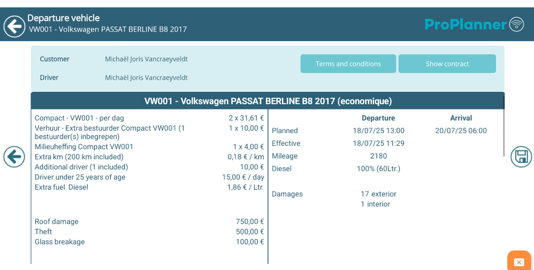 If we open the contract by double clicking we can now consult the signed check-out documents in the tile 'documents'.