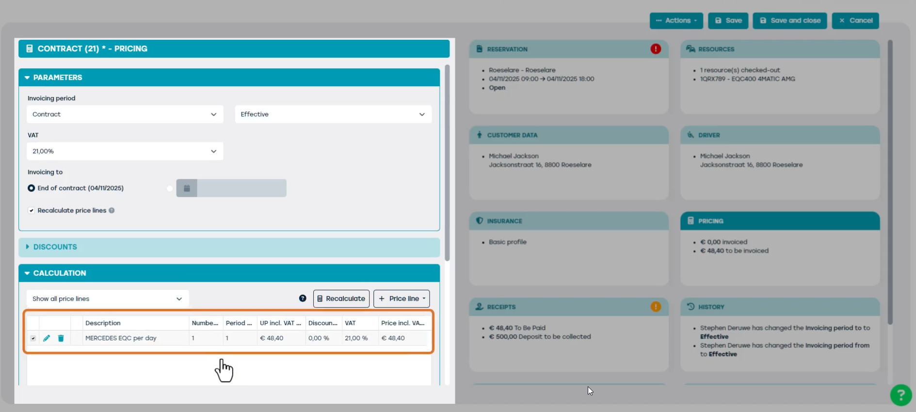 When you recalculate the price, the contract date will be taken into account, and the customer will only be charged for one day instead of two.