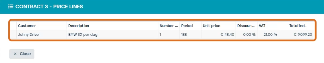 By double-clicking a contract, you’ll get a detailed view of all price lines still to be invoiced, as well as the lines that have already been invoiced within that contract.