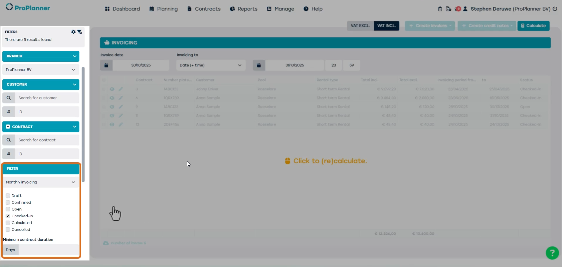 After clicking on calculate you'll see a list of all contracts with an outstanding balance that match the filters set on the left side of the screen.