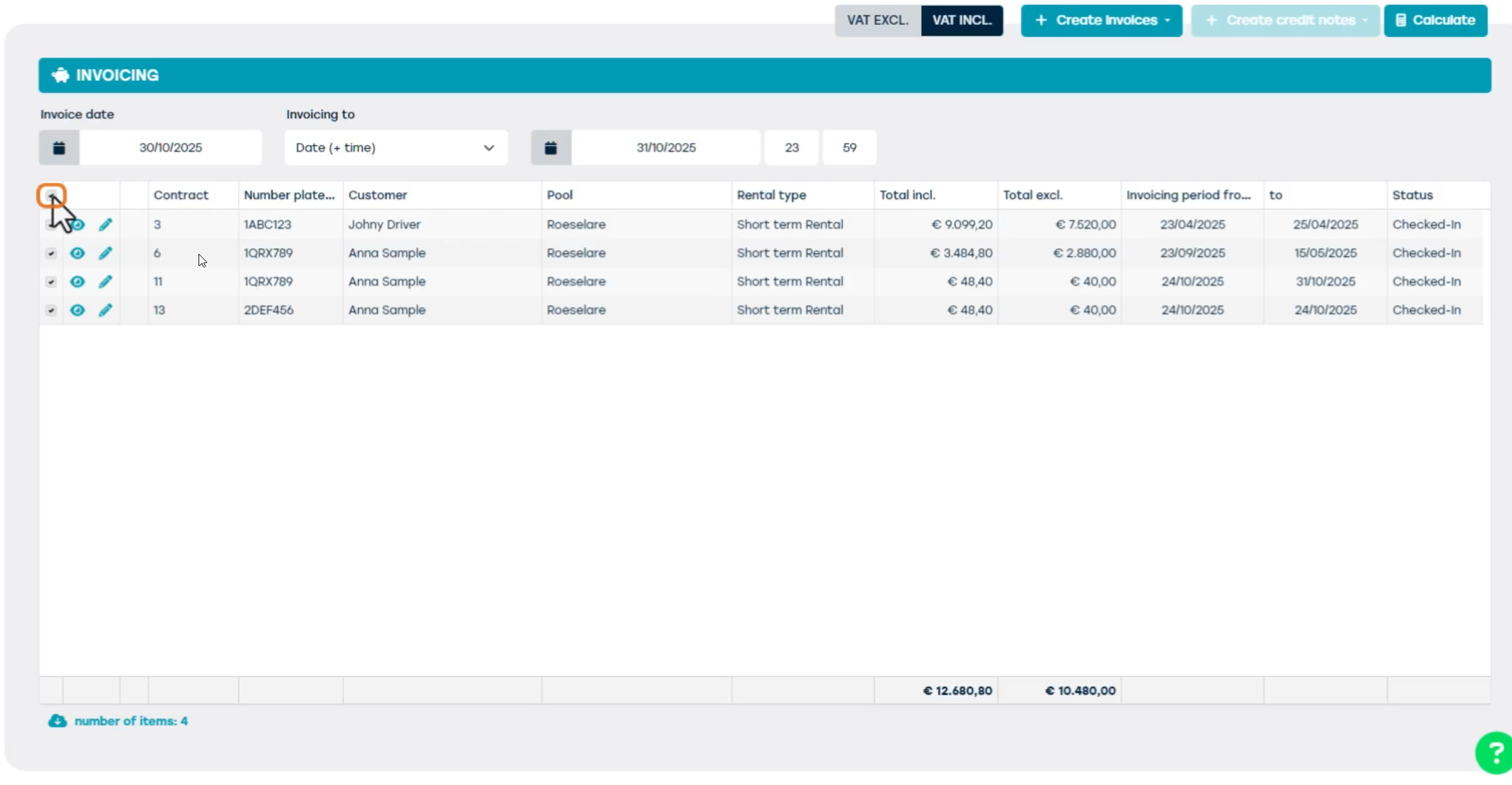 Thanks to the extensive filtering options, you can approach the invoicing process in a highly targeted way. For example, you can choose to invoice only checked-in contracts or split long-term contracts and invoice them month by month. This makes it possible to generate invoices swiftly and accurately, with the flexibility to match your individual needs.