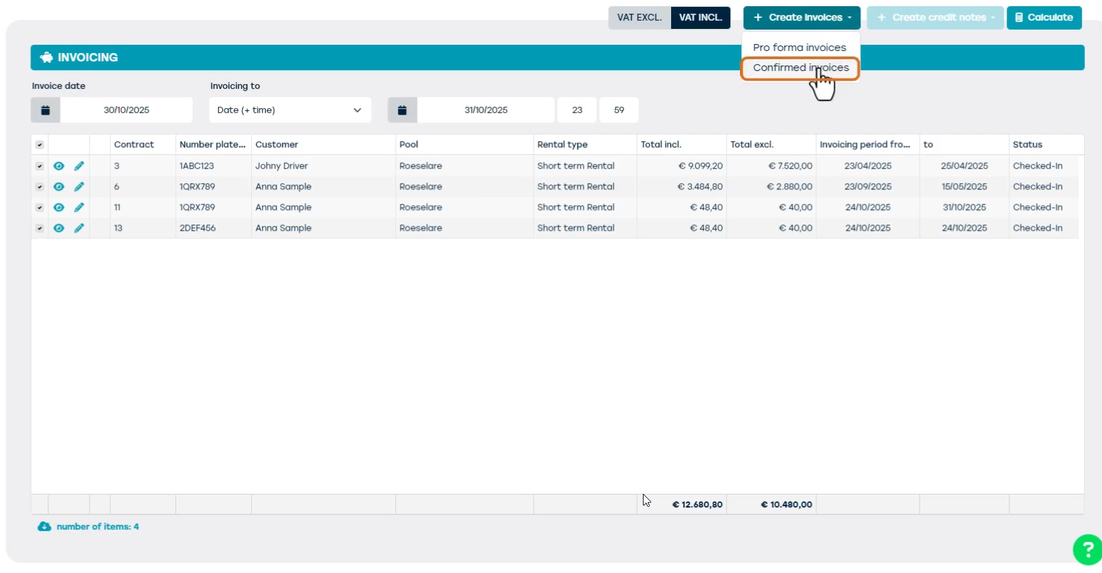 Then, click the ‘+ Create Invoices’ button in the top right corner and choose the ‘Confirmed invoices’ option.
