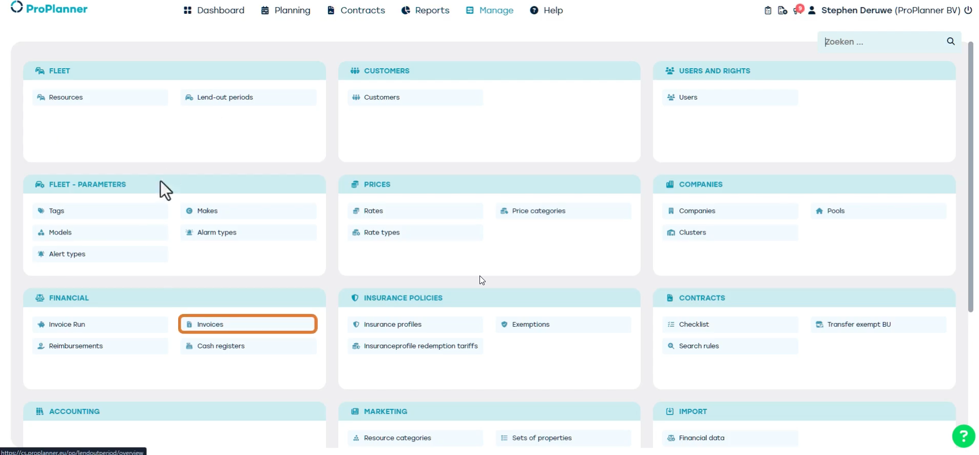 Once the invoices are created, you can find them on the respective contracts under the ‘Tarification’ tab, or via the general overview of all invoices under Manage, Financial and then Invoices.