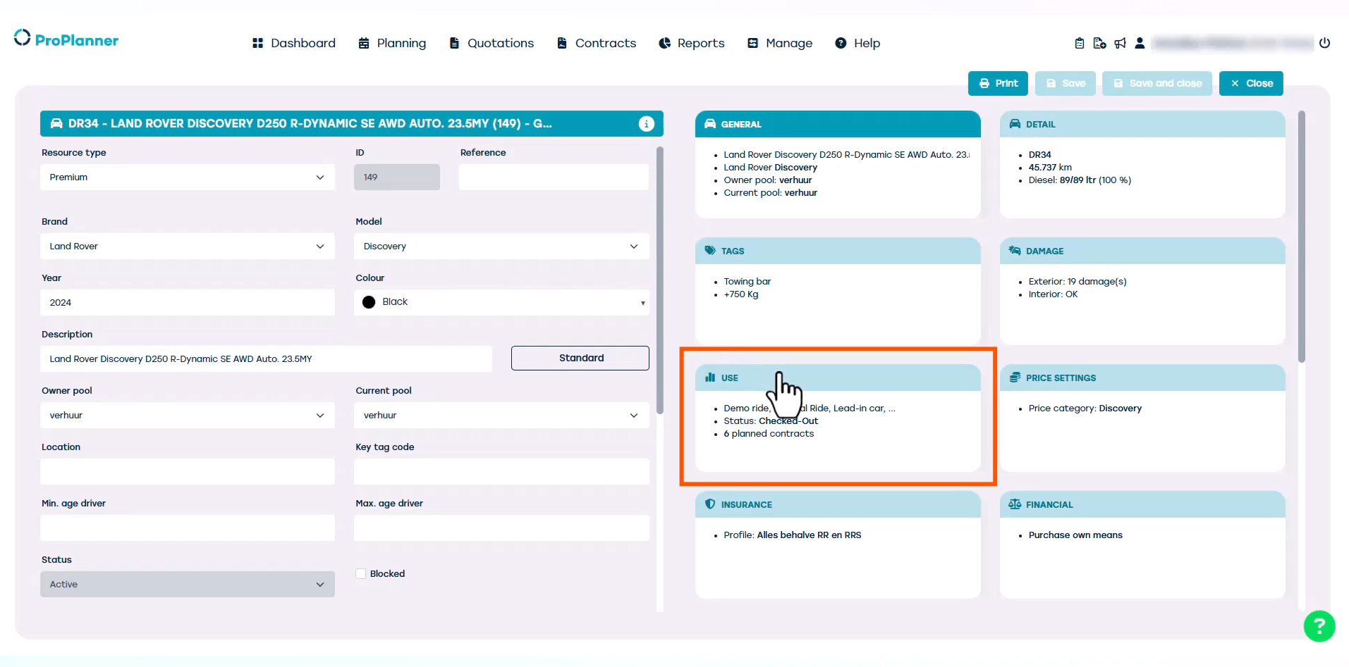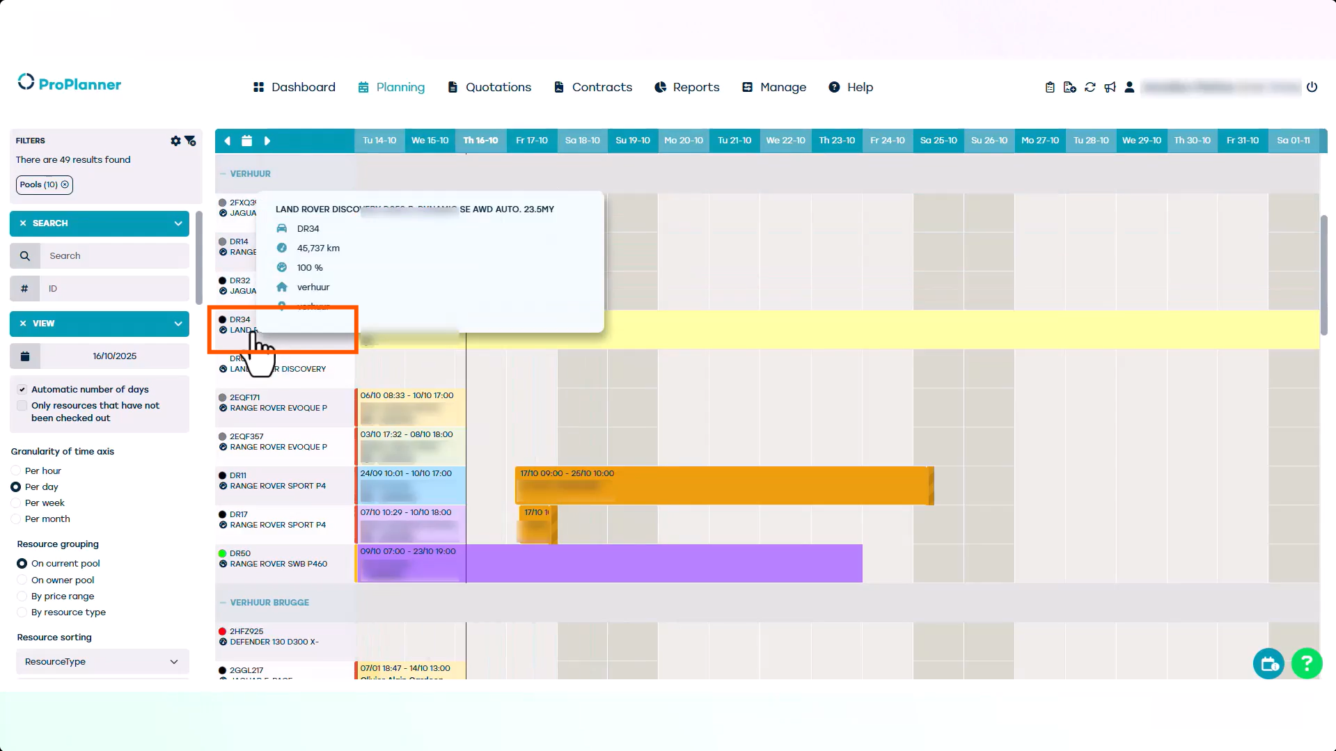 First, let's open a resource sheet for a vehicle that is available for rent. We can do this by going to the planning and clicking on one of the resources.