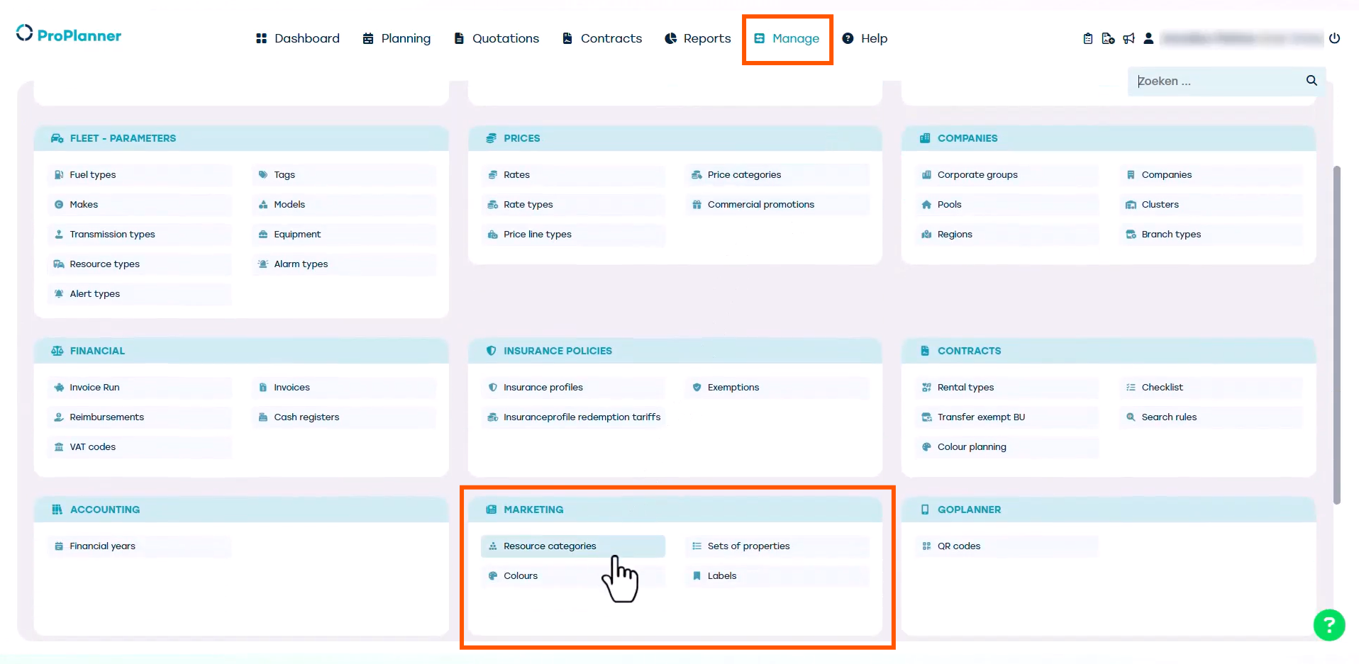 We can find the resource categories by going to 'Manage'. We find the 'Marketing' tile and click on 'Resource categories'. Here, we can find an overview of all the resource categories.