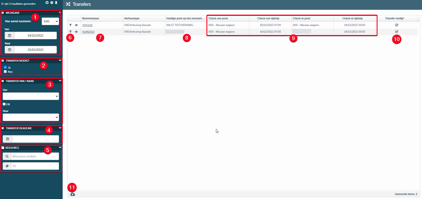 La date limite pour un transfert est la date à laquelle le contrat exigeant le transfert commencera (c.-à-d. la date de check-out).- Dans le filtre « Transfert nécessaire ? » (2), vous déterminez si vous voulez voir uniquement les transferts nécessaires et/ou les contrats pour lesquels aucun transfert n’est requis. Par défaut, cette option sera paramétrée pour vous montrer uniquement la liste des transferts nécessaires.