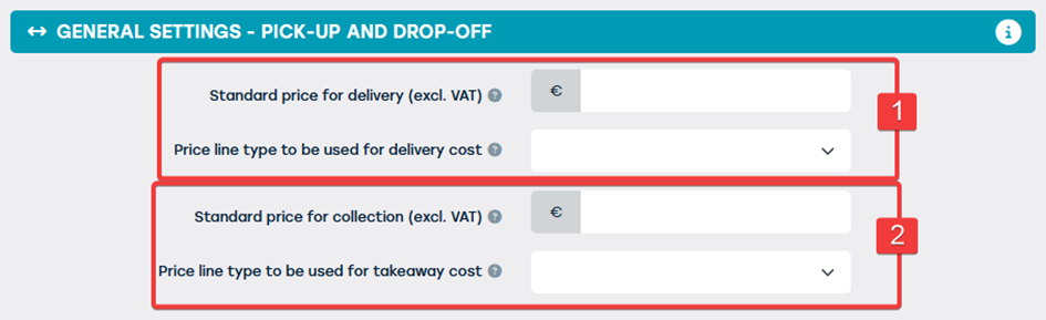 Outre ces données opérationnelles, le module veille également à ce que les frais correspondants soient automatiquement facturés. Via Gestion > Paramètres généraux > Enlèvement et livraison, vous pouvez définir un prix standard et un type de liste de prix pour la livraison (1) et l'enlèvement (2).