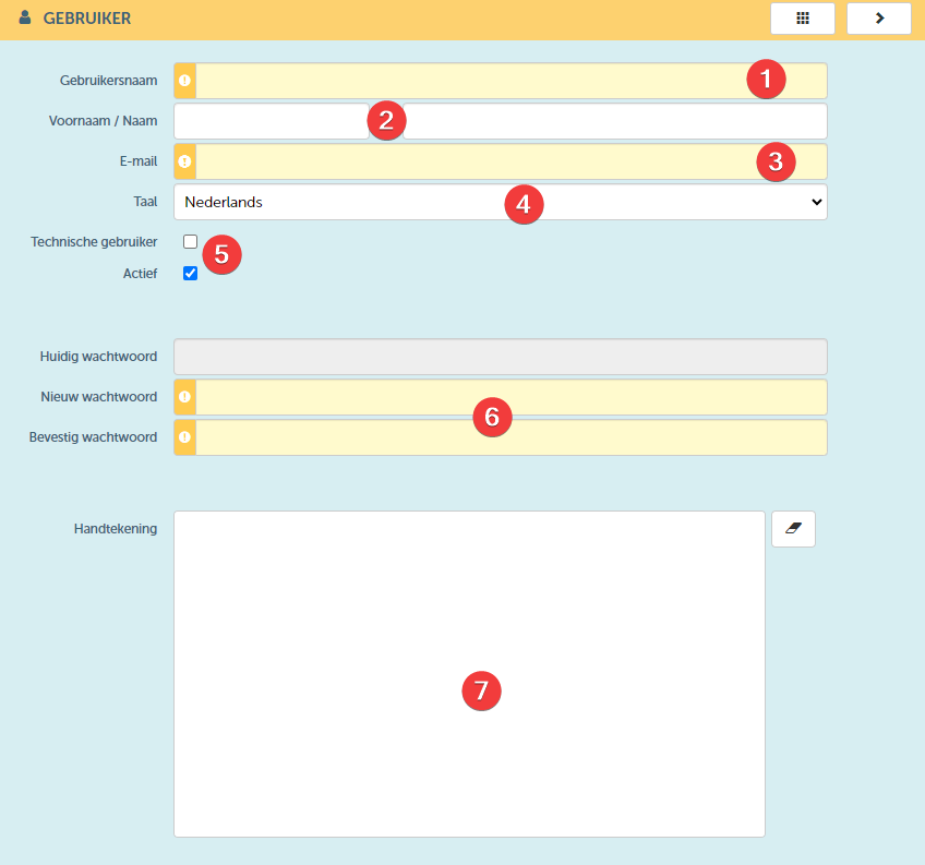 | 5 | Via deze checkboxen kan je aanduiden of het om een technische gebruiker gaat (i.e. een gebruiker die nodig is om een extern systeem toegang te geven tot ProPlanner) of niet. Vous pouvez également désactiver un utilisateur existant à l’aide de la case « Actif », lui retirant ainsi l’accès à ProPlanner. | Aan- of uitvinken | |