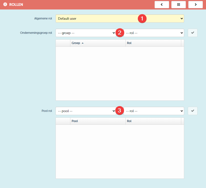 We raden dan ook aan om elke gebruiker aan te maken als een basisgebruiker op het hoogste niveau (i.e. Algemene rol) om vervolgens zijn rechten desgewenst uit te breiden op het niveau van de ondernemingsgroep of pool.