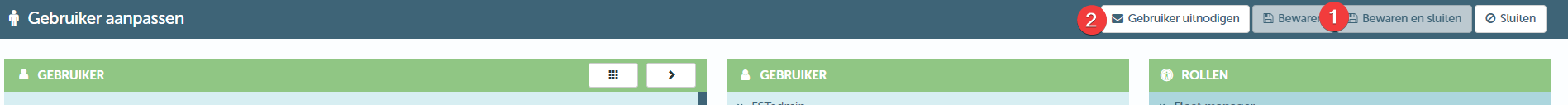 Après avoir tout configuré correctement, vous pouvez enfin créer le nouvel utilisateur en enregistrant ses données (via le bouton « Sauvegarder » ou « Sauvegarder et fermer ») (1). Ce n’est qu’une fois l’utilisateur sauvegardé que le bouton « Inviter l’utilisateur » (2) est activé.