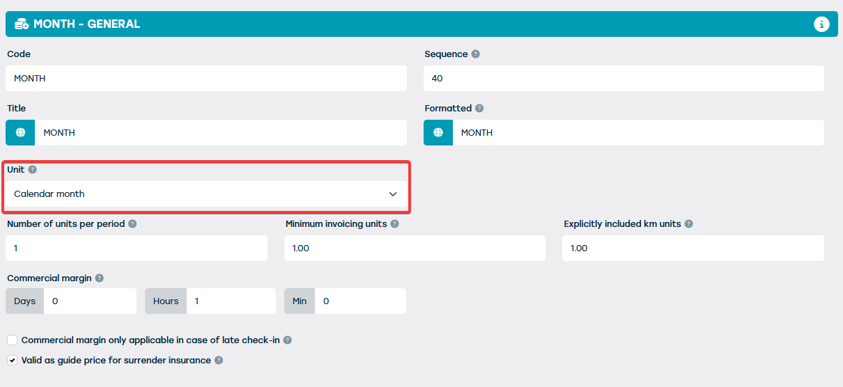 Aux points 1.2 et 4, lors de l’application d’un taux résiduel, ces montants seront également calculés au prorata dès que vous choisissez « par unité de période ». Au point 3, les kilomètres supplémentaires sont toujours calculés au prorata.