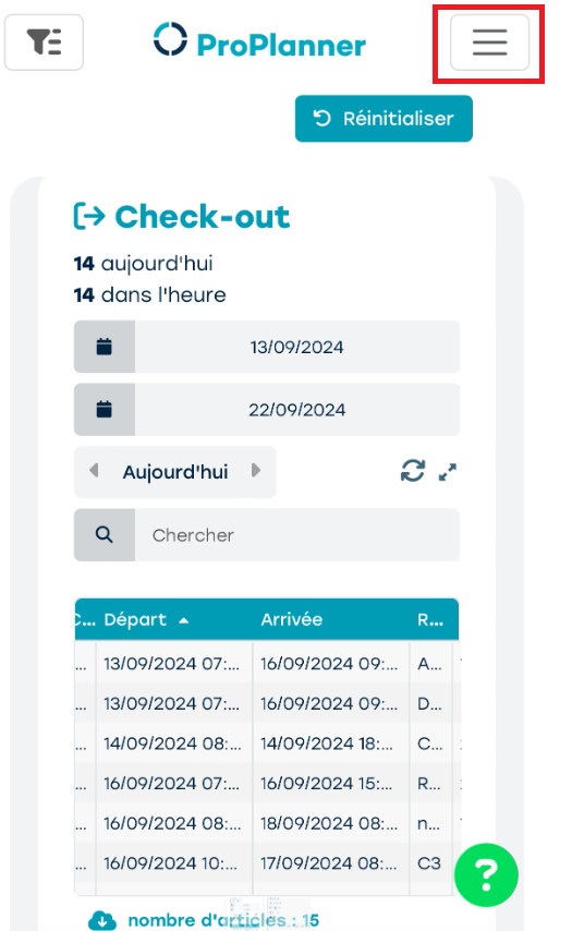 Vous pouvez naviguer entre les différents menus grâce au menu hamburger situé en haut à droite.
