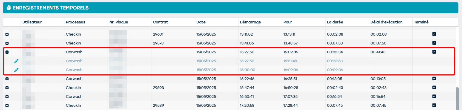 Ce rapport peut être utilisé pour déterminer le temps que l'utilisateur a passé à effectuer un check-out, un check-in ou un carwash (en fonction des paramètres) au cours de la période de référence qui, par défaut, est fixée aux sept derniers jours. Chaque ligne indique la durée pendant laquelle l'utilisateur a travaillé sur le check-out, le check-in ou le carwash en question. La ligne peut être dépliée pour afficher les enregistrements du temps sous-jacents pour l'action spécifique (sans les pauses) et les ajuster si nécessaire (via l'icône de crayon).