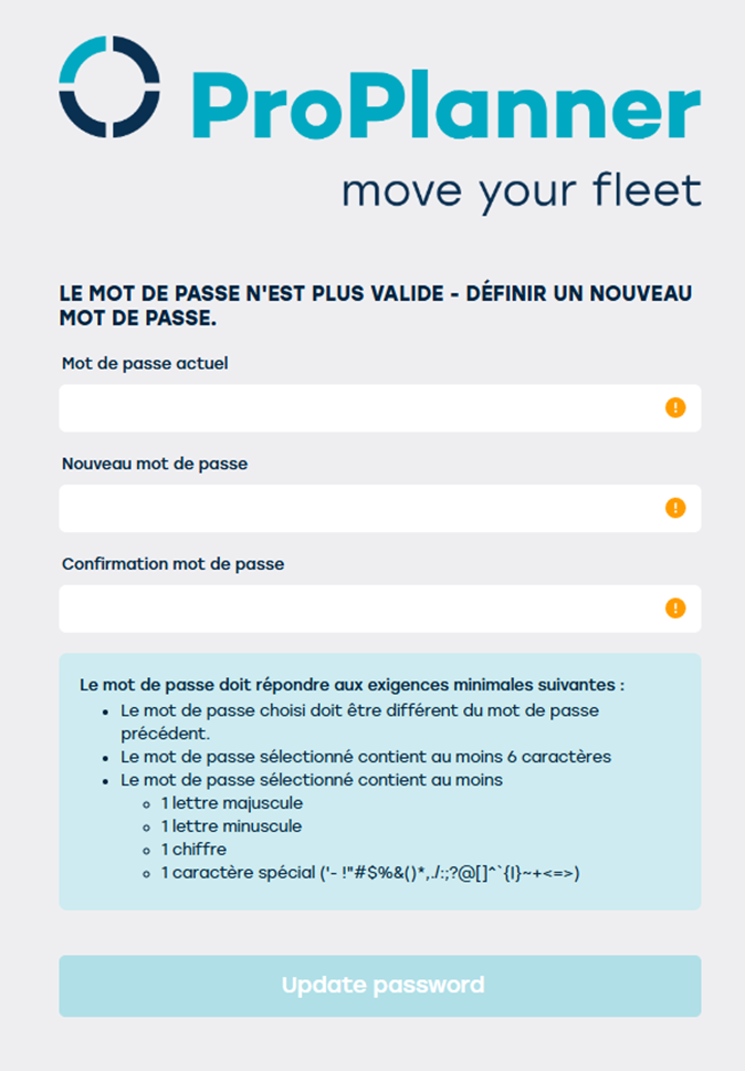 Une semaine avant que le mot de passe ne doive être modifié, le grille-pain suivant apparaîtra par défaut dans ProPlanner en bas de page:
