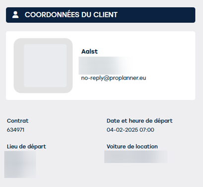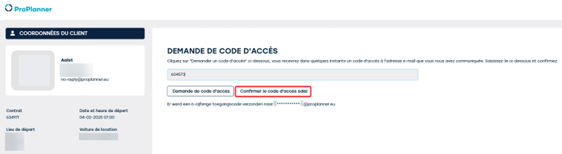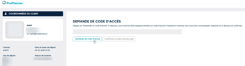 Lorsque ce conducteur clique sur le lien, il a à nouveau la possibilité de faire générer un code d'accès qui lui est envoyé à son adresse mail. Lorsqu'il saisira ce code dans l'écran d'accueil, il aura accès à l'écran où il pourra, tout comme le client, compléter ses données clients et ses données bancaires et d'identité (voir également plus haut).