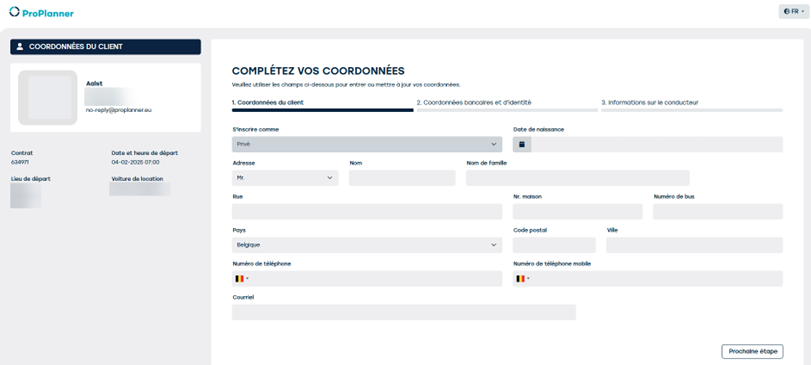 Dans l'écran suivant, le client peut commencer à compléter ses données personnelles, ses coordonnées bancaires et d'identité, ainsi que les données relatives au conducteur. Il peut toujours passer à l'écran suivant en cliquant sur le bouton en bas à droite : « étape suivante ».