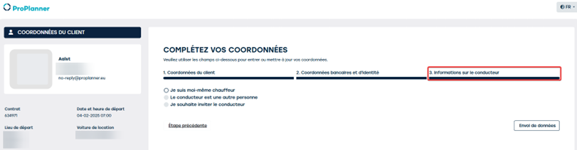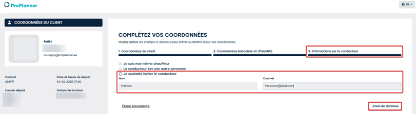 Si le client souhaite inviter un conducteur, il doit indiquer son nom et son e-mail. Il peut envoyer les données en cliquant sur le bouton « Envoi de données » en bas à droite.