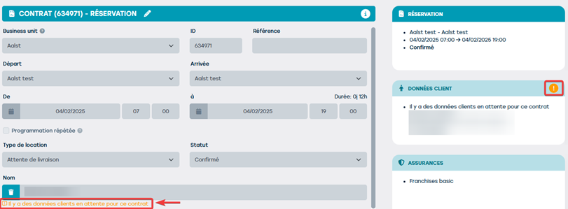 Dans ce cas, vous verrez toutefois apparaître l'alerte « Il reste des données client à traiter dans le cadre de ce contrat ». Cette alerte est visible au niveau des données du client et des données personnelles elles-mêmes :