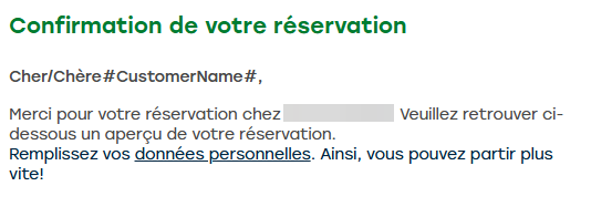 Vous pouvez laisser le client compléter ses propres données sur le contrat afin qu'il soit mieux préparé et que l'enregistrement se fasse plus facilement. Pour ce faire, vous pouvez utiliser le tag #SelfRegistrationLink# que vous pouvez inclure dans votre modèle d'e-mail de confirmation.