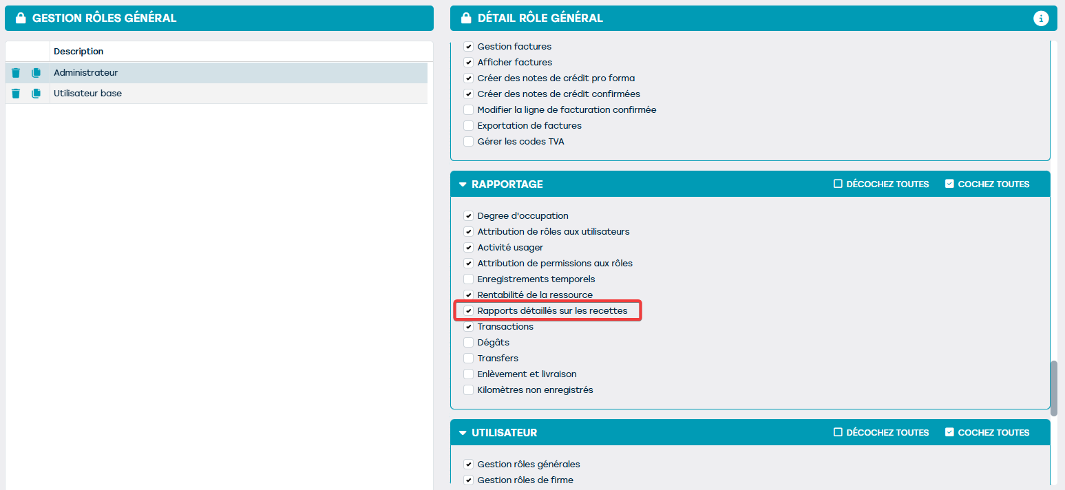 Pour accéder à ce rapport, vous devez disposer des autorisations appropriées. Dans le rôle général, le droit à la rapports détaillés sur les recettes doit être coché sous rapports.7