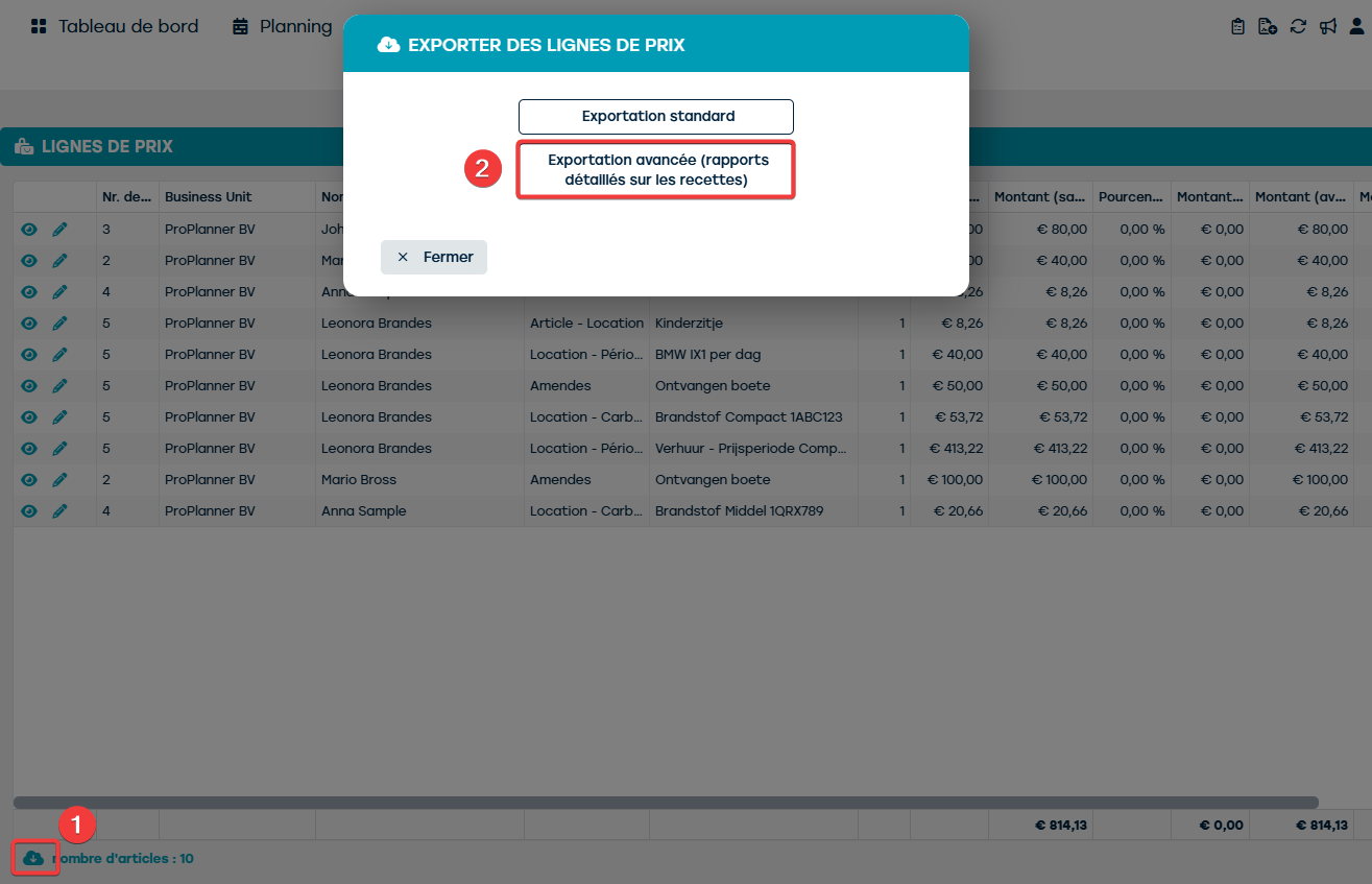 Une fois que tout est affiché, vous pouvez exporter en utilisant l'icône de nuage en bas. Dans la fenêtre pop-up, vous aurez le choix entre une exportation standard et une exportation avancée (rapport detaillés sur les recettes).