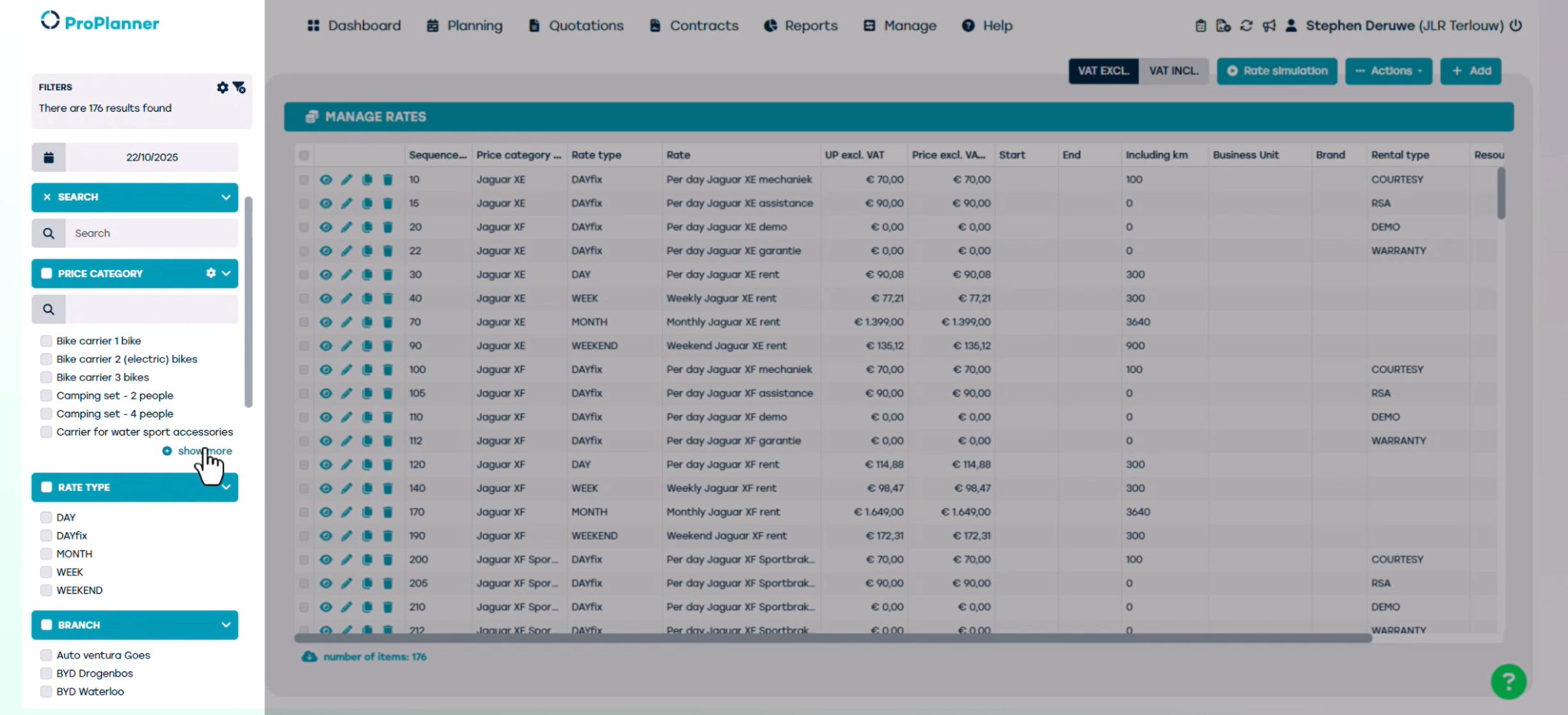 Sur cet écran, vous trouverez un aperçu de tous les tarifs disponibles pour votre société. À gauche de l'écran, vous pouvez utiliser différents filtres — par exemple, selon la catégorie de prix ou le type de tarif, pour trouver rapidement le tarif correct.