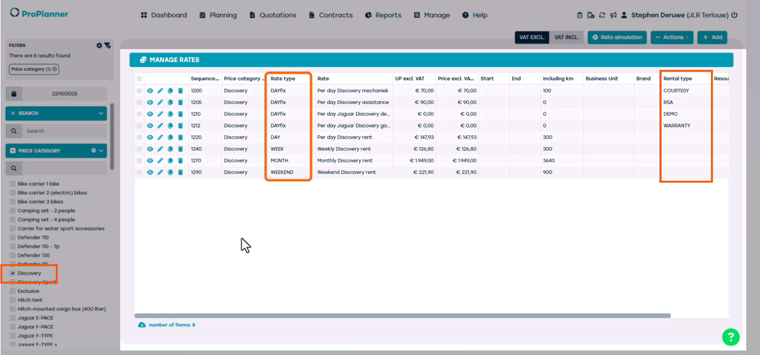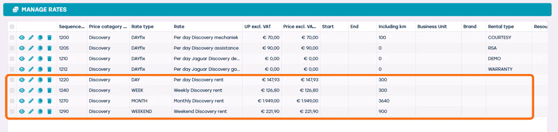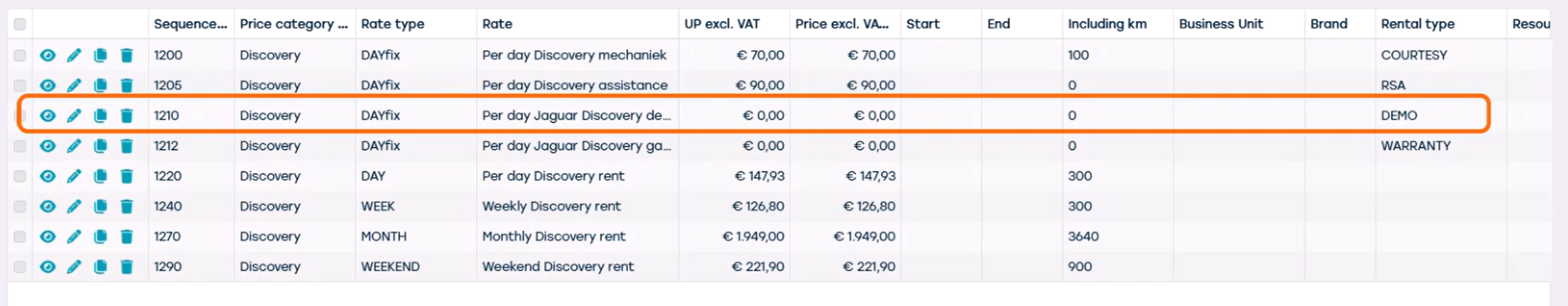 Au sein de cette catégorie de prix, vous pouvez voir que plusieurs tarifs sont disponibles. Chaque tarif est lié à un type de tarif spécifique et peut également être associé à un type de location
