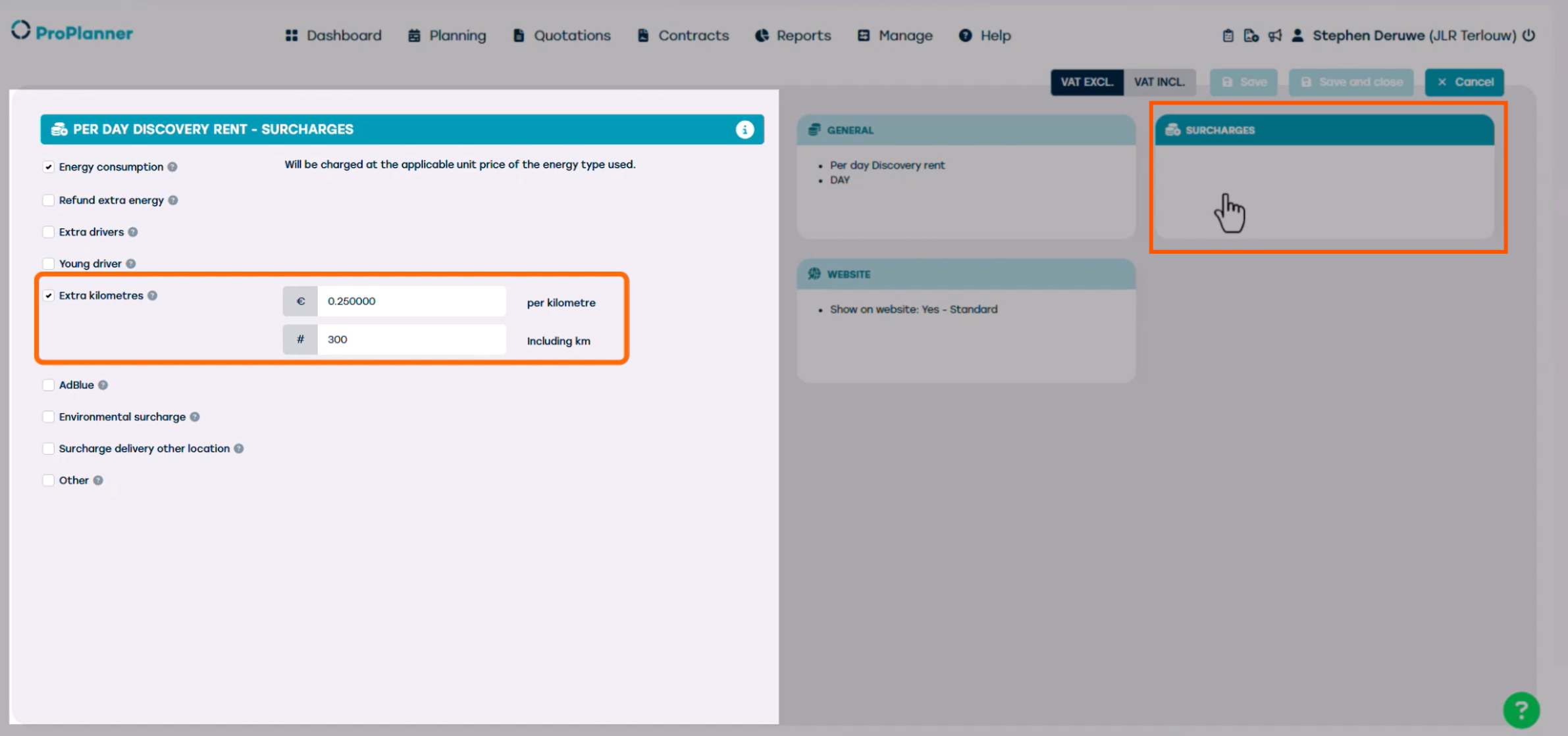 De plus, vous définissez le supplément par kilomètre supplémentaire, au cas où le nombre autorisé de kilomètres serait dépassé. ProPlanner calcule automatiquement le nombre de kilomètres inclus — proportionnellement si besoin, selon la période de location. Si le nombre de kilomètres parcourus dépasse cette limite, une ligne de prix supplémentaire est générée automatiquement. Cette ligne contient le nombre de kilomètres supplémentaires multiplié par le tarif fixé par kilomètre.
