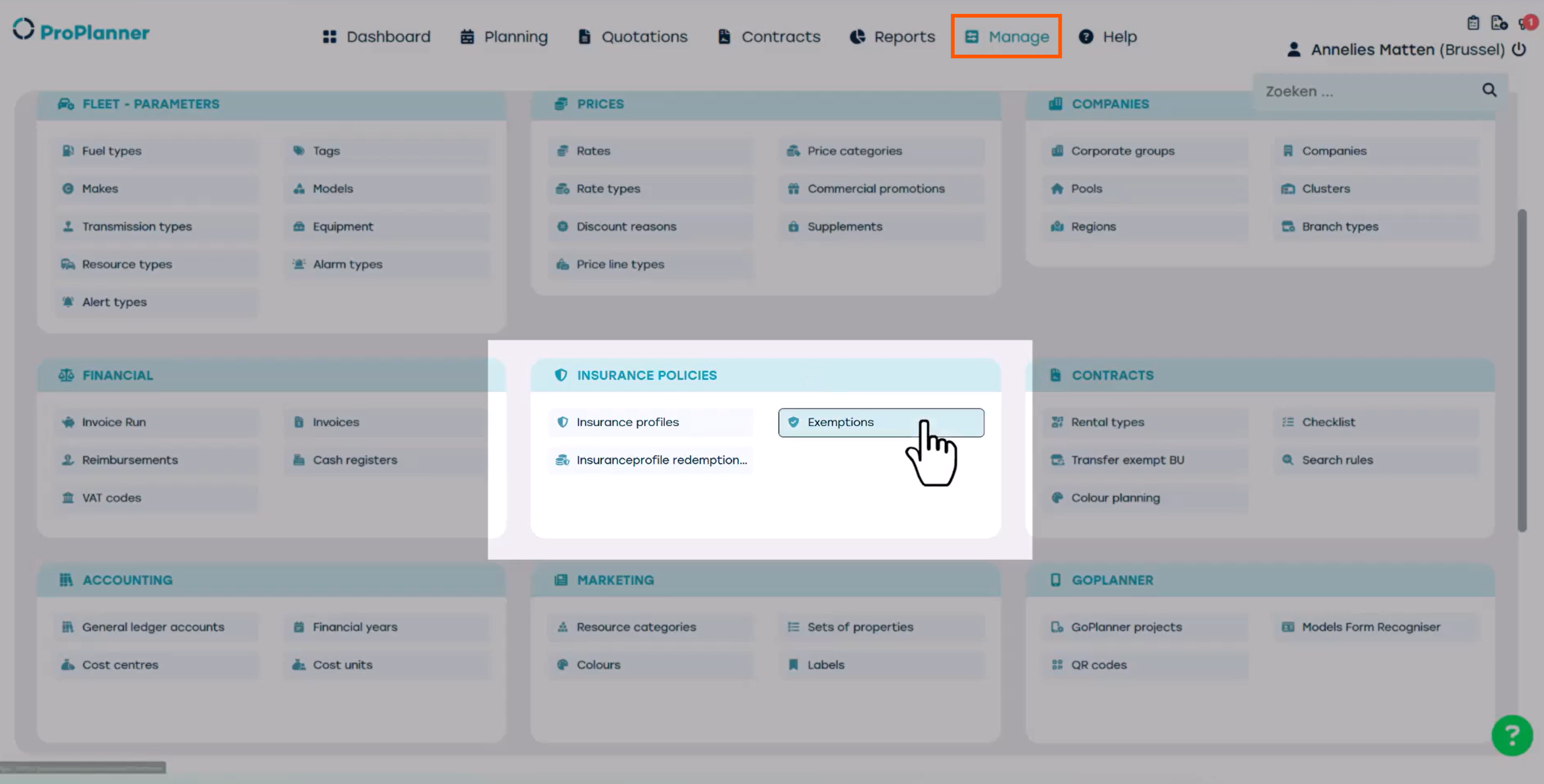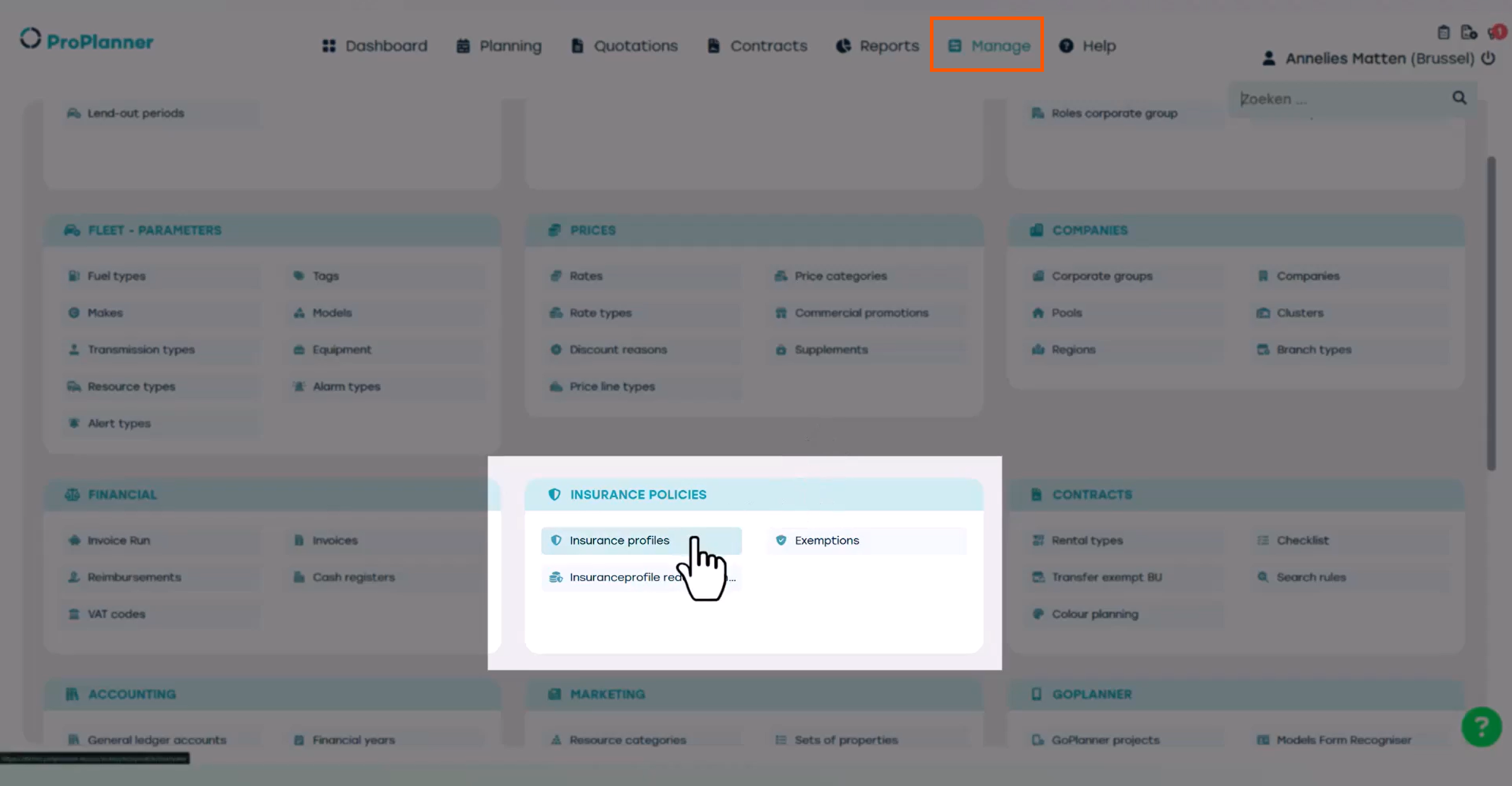 Une fois que vous avez créé toutes les exonérations nécessaires, vous pouvez créer un nouveau profil d’assurance. Retournez au menu principal « Gérer », allez sur la tuile « Polices d’assurance » puis cliquez sur « Profils d’assurance ».