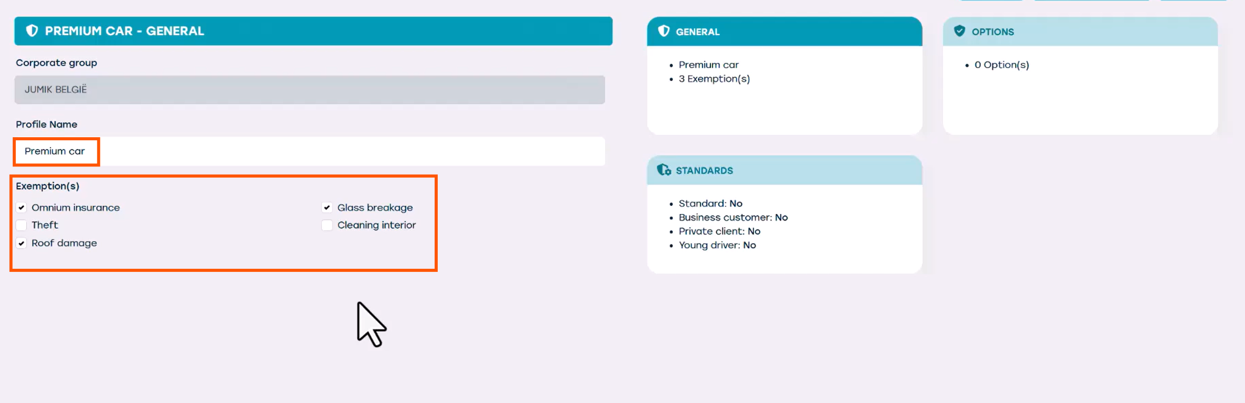 Commencez par donner au profil un nom reconnaissable pour votre organisation, tel que « Voiture Premium ». Sélectionnez ensuite toutes les exonérations que vous souhaitez inclure.