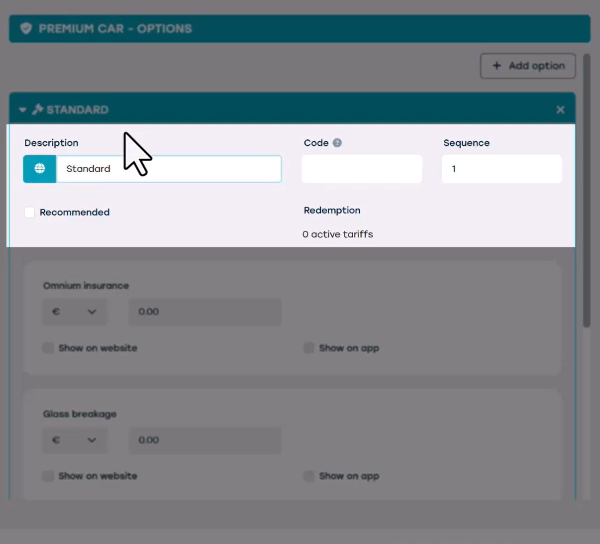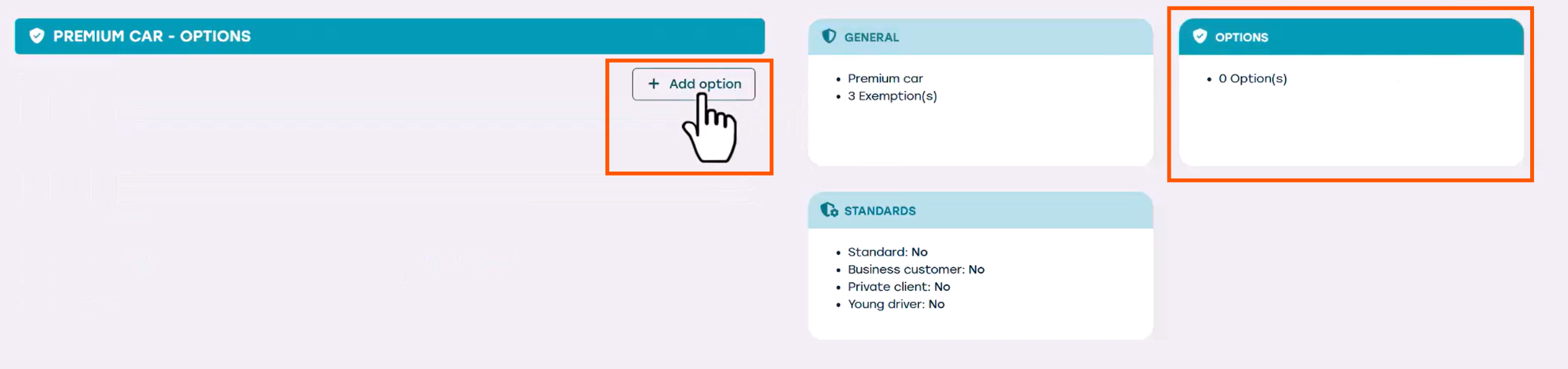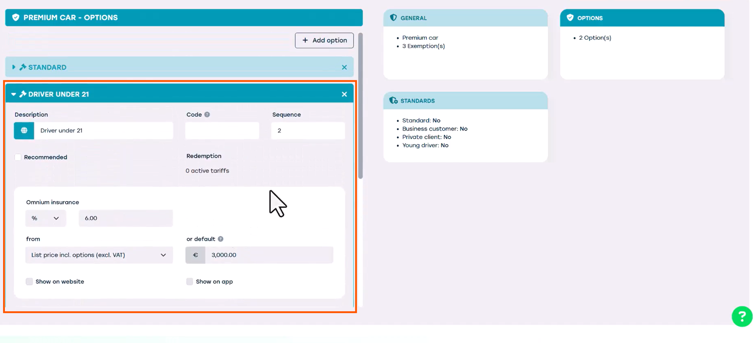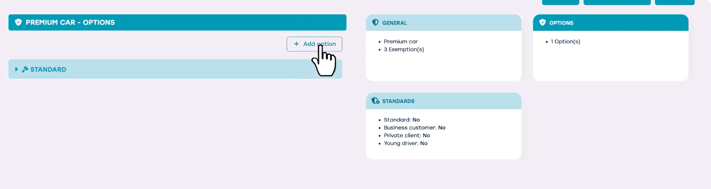 Dans la tuile « Options », vous pouvez attribuer des valeurs à chaque exonération en cliquant sur « ajouter une option ». Nous donnons à l’option un nom, comme « Standard ».